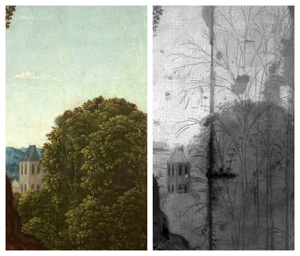 Independentemente da autoria, o desenho subjacente foi rigorosamente seguido nas pinturas da face exterior dos volantes, mas nalguns motivos das outras representações isso não aconteceu. É exemplo o pormenor aqui apresentado do painel sobre a Tentação de Cristo que mostra que a árvore inicialmente desenhada, nua e de grande altura, não é a árvore, frondosa e baixa, efectivamente pintada (ao contrário do que aconteceu com a pequena torre ao lado). Não obstante o uso de modelos previamente realizados testemunhado pelos motivos desenhados com rigor e detalhe, desvios como aquele permitem concluir que a pintura não estava completamente decidida quando começou a ser concretizada.